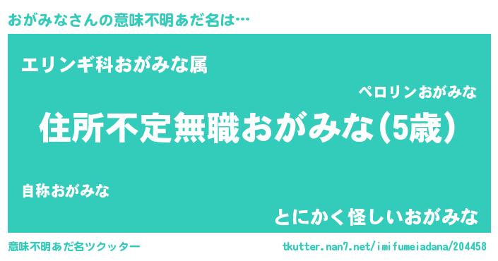 | 男性向けラノベタイトル風あだ名 | 『この素晴らしい世界におがみなを!』 |