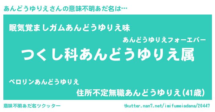 | 男性向けラノベタイトル風あだ名 | 『あんどうゆりえ~年齢イコール彼女いない歴の魔法使い~』 |
