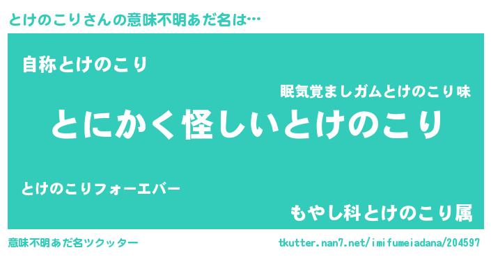 | 男性向けラノベタイトル風あだ名 | 『とけのこりの嫁は女の子じゃないと思った?』 |