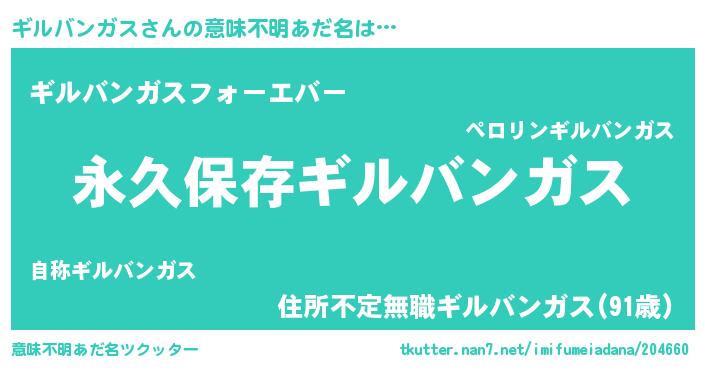 | 男性向けラノベタイトル風あだ名 | 『ギルバンガスという概念が存在しない退屈な世界 』 |