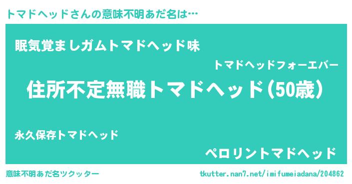 | 男性向けラノベタイトル風あだ名 | 『魔弾の王とトマドヘッド』 |