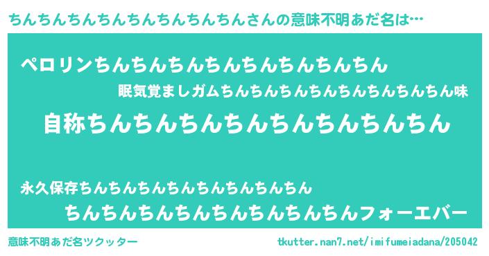 | 男性向けラノベタイトル風あだ名 | 『Re:ちんちんちんちんちんちんちんちんから始める異世界生活』 |
