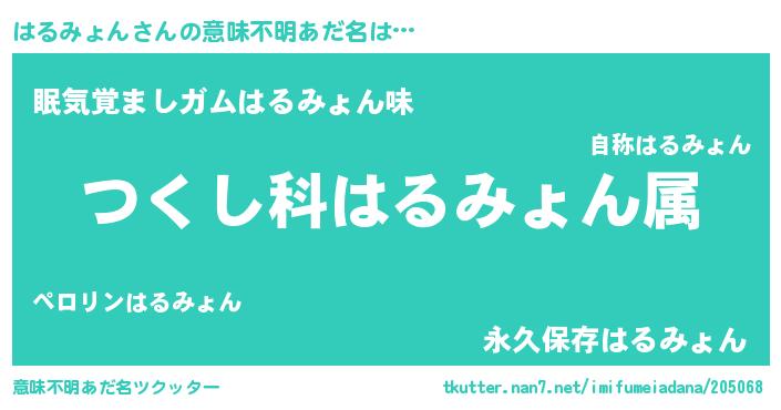 | 男性向けラノベタイトル風あだ名 | 『うちのはるみょんが世界を掌握している!』 |