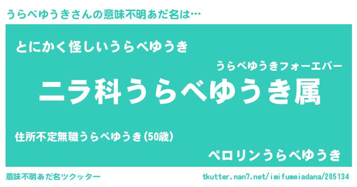 | 男性向けラノベタイトル風あだ名 | 『うらべゆうき~年齢イコール彼女いない歴の魔法使い~』 |