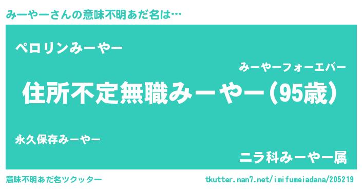 | 男性向けラノベタイトル風あだ名 | 『うちのみーやーが世界を掌握している!』 |