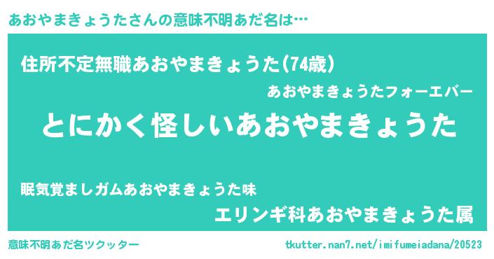 | ポケモン風あだ名 | 『ヒアオヤマキョウタ』『アーオイ』 |