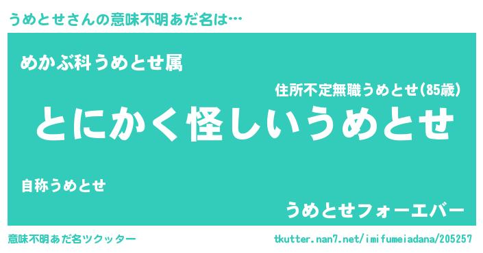 | 男性向けラノベタイトル風あだ名 | 『うめとせの嫁は女の子じゃないと思った?』 |