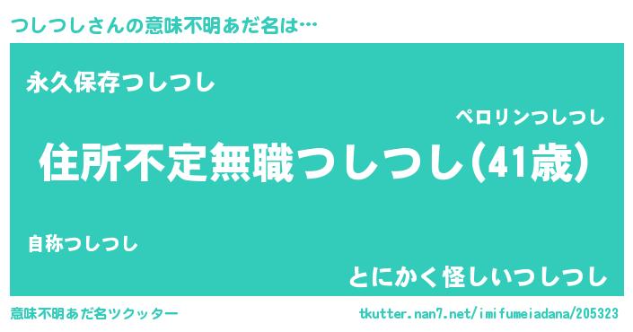 | 男性向けラノベタイトル風あだ名 | 『魔弾の王とつしつし』『つしつしの憂鬱』 |