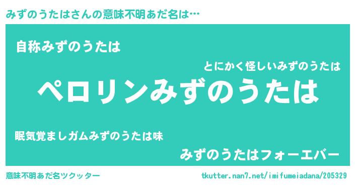 | 男性向けラノベタイトル風あだ名 | 『うちのみずのうたはが世界を掌握している!』 |