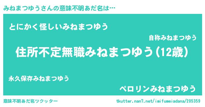 | 男性向けラノベタイトル風あだ名 | 『うちのみねまつゆうが世界を掌握している!』 |