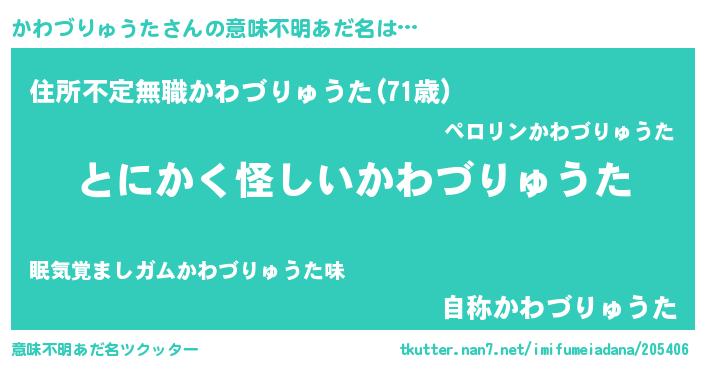 | 男性向けラノベタイトル風あだ名 | 『かわづりゅうたの嫁は女の子じゃないと思った?』 |