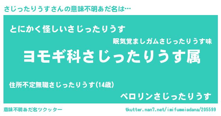 | 男性向けラノベタイトル風あだ名 | 『さじったりうす~年齢イコール彼女いない歴の魔法使い~』 |