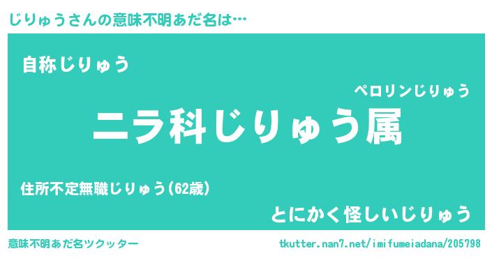 | 男性向けラノベタイトル風あだ名 | 『じりゅう~年齢イコール彼女いない歴の魔法使い~』 |