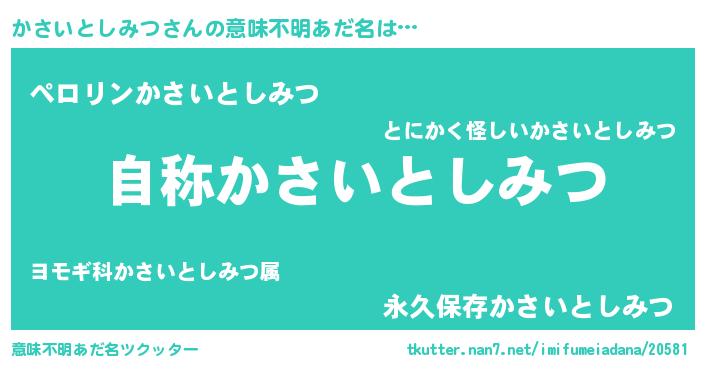 | 男性向けラノベタイトル風あだ名 | 『Re:かさいとしみつから始める異世界生活』 |