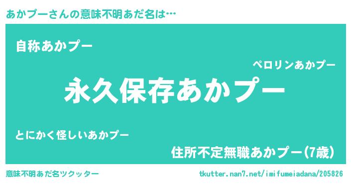 | 男性向けラノベタイトル風あだ名 | 『あかプーという概念が存在しない退屈な世界 』 |