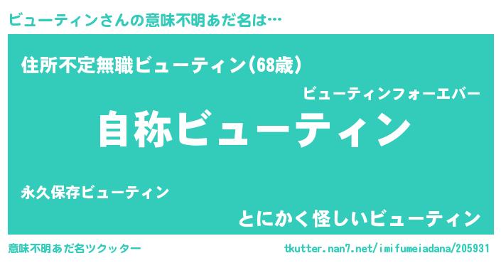 | 男性向けラノベタイトル風あだ名 | 『Re:ビューティンから始める異世界生活』 |