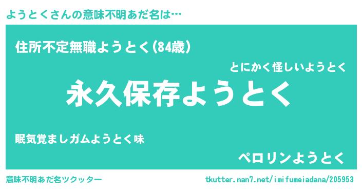 | 男性向けラノベタイトル風あだ名 | 『ようとくという概念が存在しない退屈な世界 』 |
