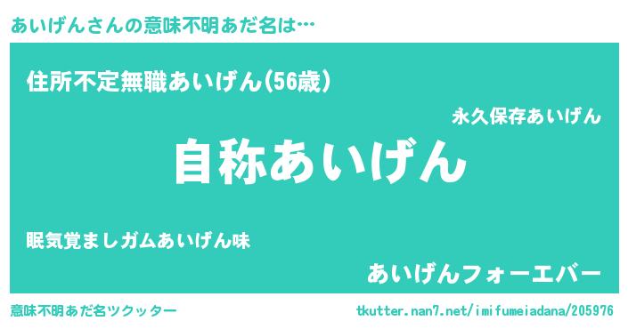 | 男性向けラノベタイトル風あだ名 | 『あいげんに滅ぼされるだけの簡単なお仕事です』 |
