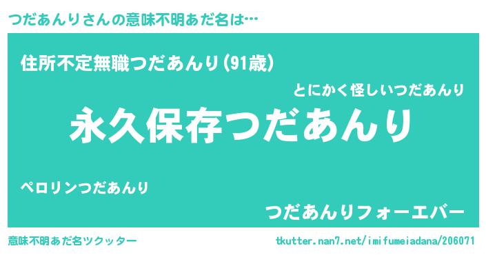 | 胡散臭い通販商品みたいなあだ名 | 『来世でも幸せになれる水素水…その名も「つだあんり」』 |
