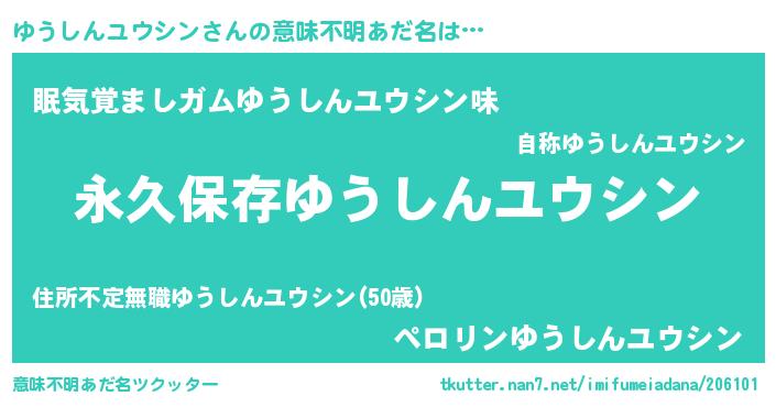 | 男性向けラノベタイトル風あだ名 | 『ゆうしんユウシンという概念が存在しない退屈な世界 』 |