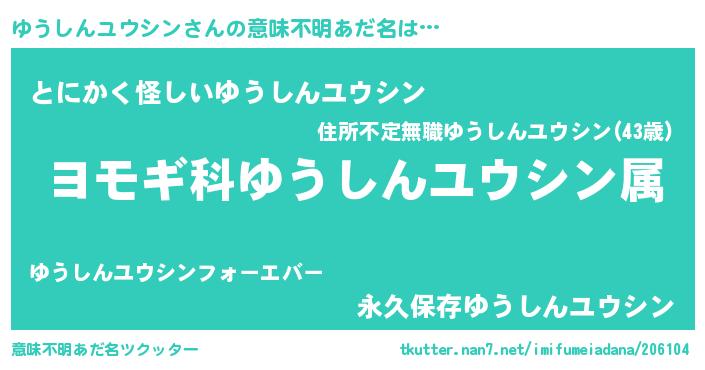 | 男性向けラノベタイトル風あだ名 | 『ゆうしんユウシン~年齢イコール彼女いない歴の魔法使い~』 |