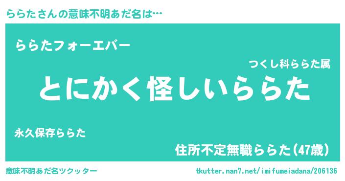 | 女子向けラノベタイトル風あだ名 | 『ららた様がみてる』『ららた伯爵の花嫁』 |