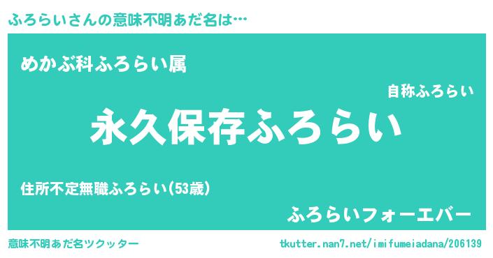 | 男性向けラノベタイトル風あだ名 | 『ふろらいという概念が存在しない退屈な世界 』 |