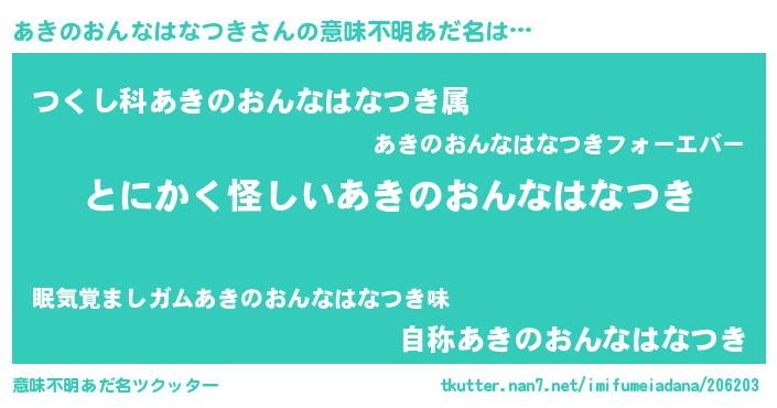 | 男性向けラノベタイトル風あだ名 | 『あきのおんなはなつきの嫁は女の子じゃないと思った?』 |