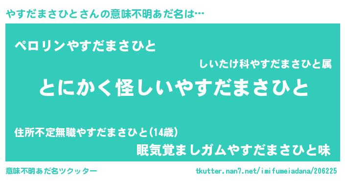 | 男性向けラノベタイトル風あだ名 | 『やすだまさひとの嫁は女の子じゃないと思った?』 |