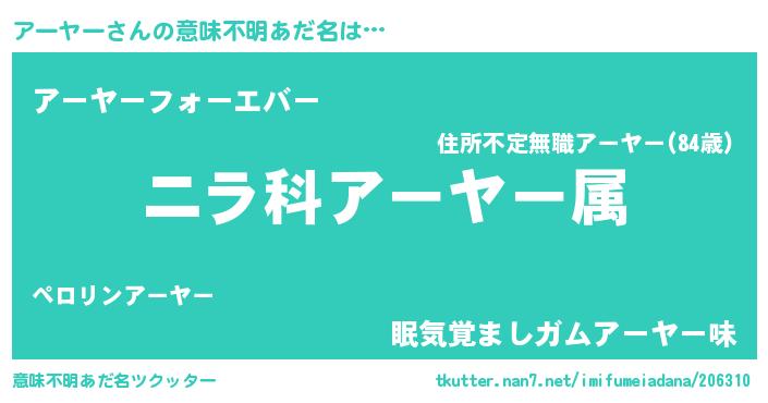| 男性向けラノベタイトル風あだ名 | 『アーヤー~年齢イコール彼女いない歴の魔法使い~』 |