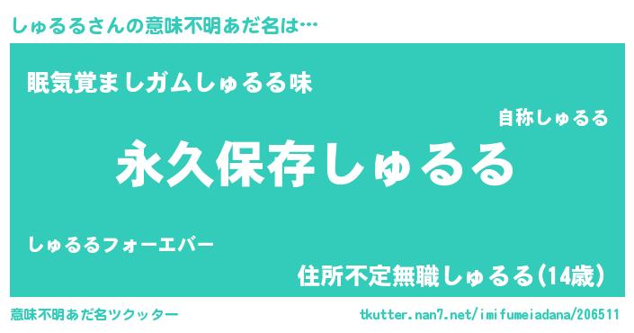 | 男性向けラノベタイトル風あだ名 | 『しゅるるという概念が存在しない退屈な世界 』 |
