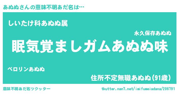 | 男性向けラノベタイトル風あだ名 | 『あぬぬに滅ぼされるだけの簡単なお仕事です』 |