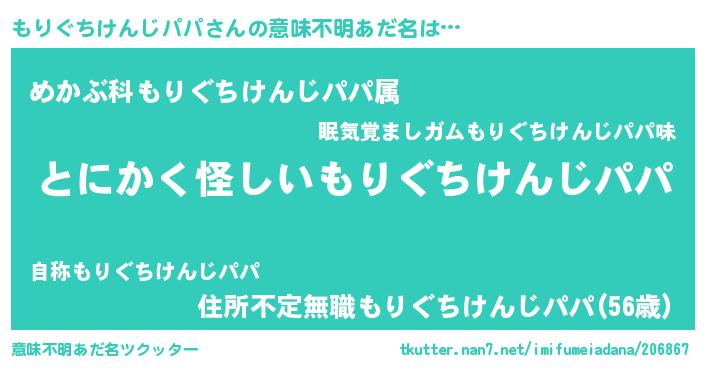 女子向けラノベタイトル風あだ名 | 『もりぐちけんじパパの卵を拾いまして』 |