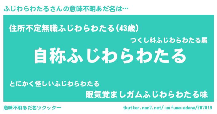 男性向けラノベタイトル風あだ名 | 『Re:ふじわらわたるから始める異世界生活』 |