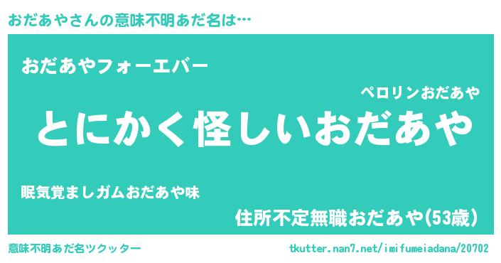 | 男性向けラノベタイトル風あだ名 | 『おだあやの嫁は女の子じゃないと思った?』 |