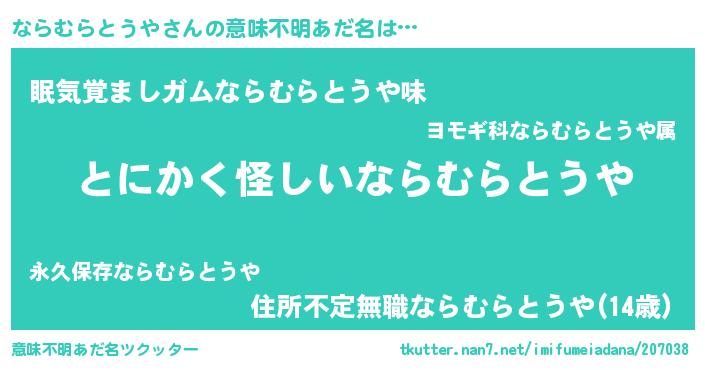 男性向けラノベタイトル風あだ名 | 『ならむらとうやに滅ぼされるだけの簡単なお仕事です』 |