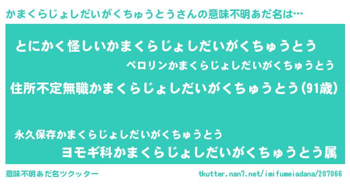 女子向けラノベタイトル風あだ名 | 『かまくらじょしだいがくちゅうとうが死なない童話 林檎のかまくらじょしだいがくちゅうとうの診療簿』 |
