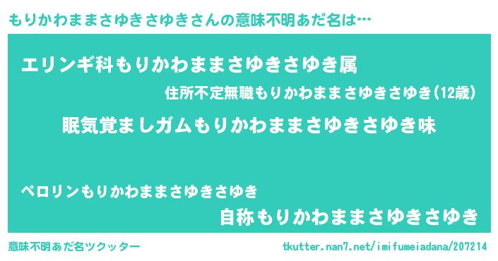 | 男性向けラノベタイトル風あだ名 | 『うちのもりかわままさゆきさゆきが世界を掌握している!』 |