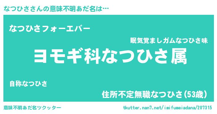 | 男性向けラノベタイトル風あだ名 | 『なつひさ~年齢イコール彼女いない歴の魔法使い~』 |