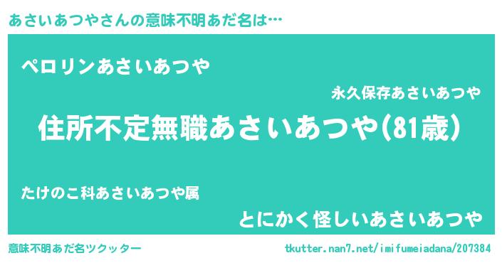 女子向けラノベタイトル風あだ名 | 『悪役あさいあつやに転生したようですが、知った事ではありません』 |