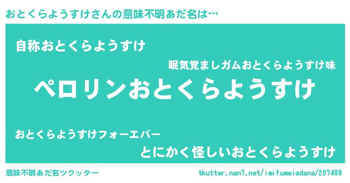 | 男性向けラノベタイトル風あだ名 | 『おとくらようすけに滅ぼされるだけの簡単なお仕事です』 |