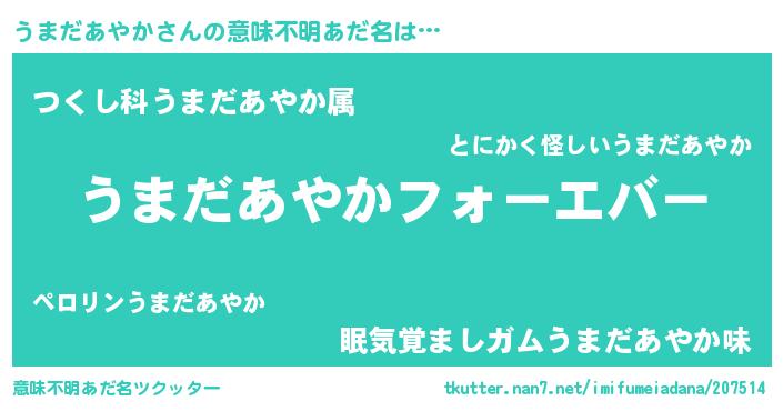 | 男性向けラノベタイトル風あだ名 | 『うちのうまだあやかが世界を掌握している!』 |