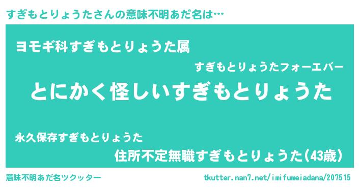 | 男性向けラノベタイトル風あだ名 | 『すぎもとりょうたの嫁は女の子じゃないと思った?』 |