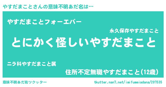| 男性向けラノベタイトル風あだ名 | 『やすだまことの嫁は女の子じゃないと思った?』 |