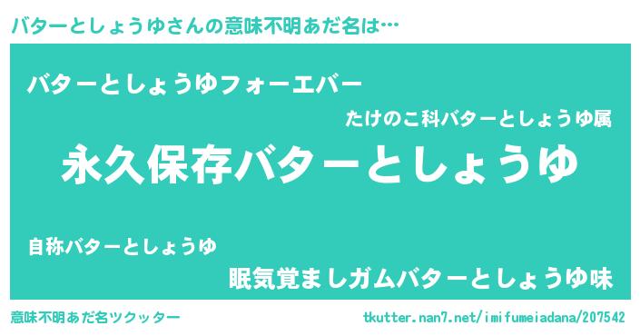 | 女子向けラノベタイトル風あだ名 | 『異世界でカフェバターとしょうゆを開店しました。』 |