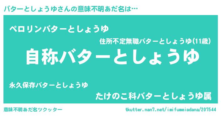 | 女子向けラノベタイトル風あだ名 | 『闇のバターとしょうゆ』 |