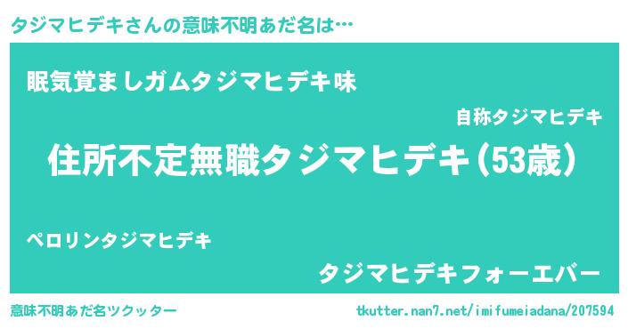 | 男性向けラノベタイトル風あだ名 | 『この素晴らしい世界にタジマヒデキを!』 |
