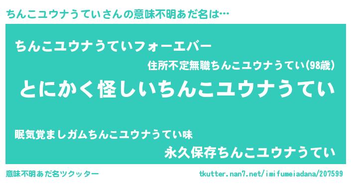 | 男性向けラノベタイトル風あだ名 | 『ちんこユウナうていに滅ぼされるだけの簡単なお仕事です』 |