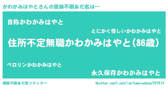 | ヘコむあだ名 | 『かわかみはやと(震え声)』『かわお』 |