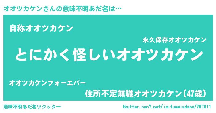 | 男性向けラノベタイトル風あだ名 | 『オオツカケンの嫁は女の子じゃないと思った?』 |